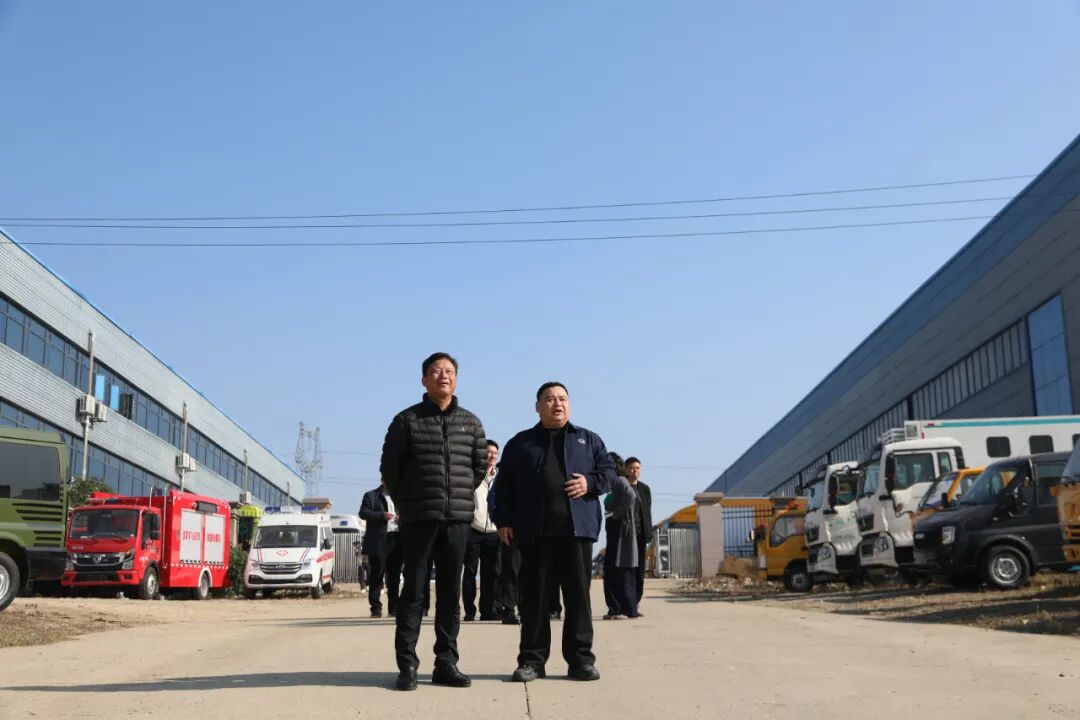 上图:江铃汽车集团党委书记、董事长邱天高(前排左一)与程力汽车集团董事长程阿罗(前排中)、程力医疗设备厂裴锐总经理(前排右)等领导嘉宾参观专用汽车及应急装备生产车间,调研了解公司经营情况。