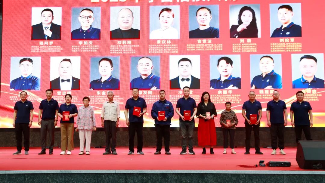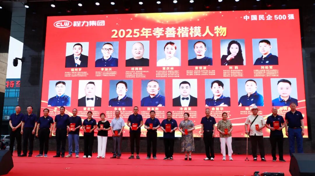 程力集团董事局常务副主席程国强(右五)、副主席郭传文(左三)、办公及主任杨祖国(右一)、董事局委员廖明洲(左四)、集团党委书记袁昌才(左二)、总经理朱武(左一),分别为程力主要创始人家族成员程道国主席(右八)、程阿罗董事长(右七)及其母亲罗玉娥(右六)颁发证书及孝心红包,第一批上台的孝善楷模人物还有:李家庆(左九)、邓莉刚(右二)、章庆林(左六)、龚世波(左五)本人及其父母家人。